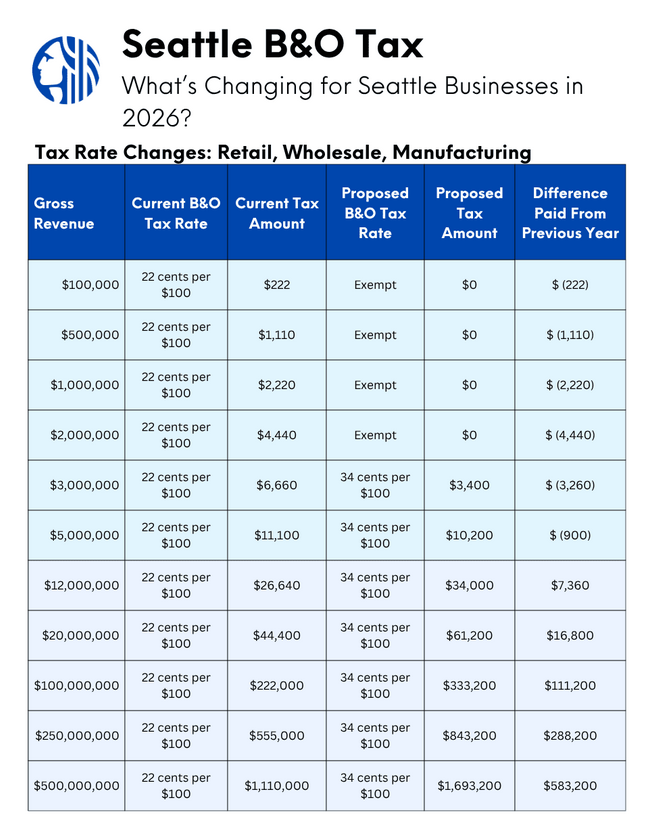 Seattle is considering a new tax proposal that would raise the Business & Occupation (B&O) tax rate while also increasing the exemption threshold for small businesses. On paper, it looks like a win for smaller companies — the exemption would jump from $100K to $2M in gross receipts, removing B&O liability for about 16,000 businesses. A new $2M deduction starting in 2027 would further lighten the load for many.